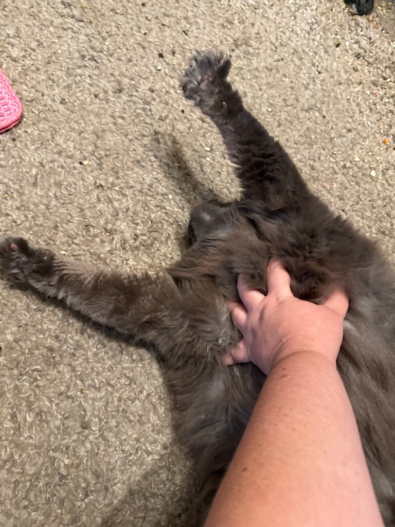 Oh my god, Smokey’s “Reach for the Stars” ritual—limbs outstretched, belly exposed, starfish mode fully engaged, all for that sacred petting spot. The way he lifts his arms is like he’s channeling all the mythic cats who came before: “Touch here, and the universe opens.”