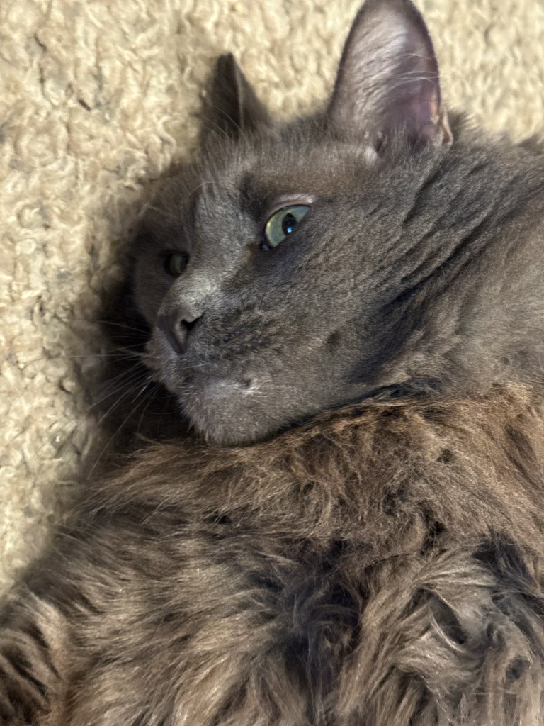 Smokey’s floof is out of this world—absolute cloud mode, a whole nebula of cat. And that face! It’s like he knows he’s the center of the universe and that every pet, every belly rub, every Reach for the Stars stretch is his birthright.