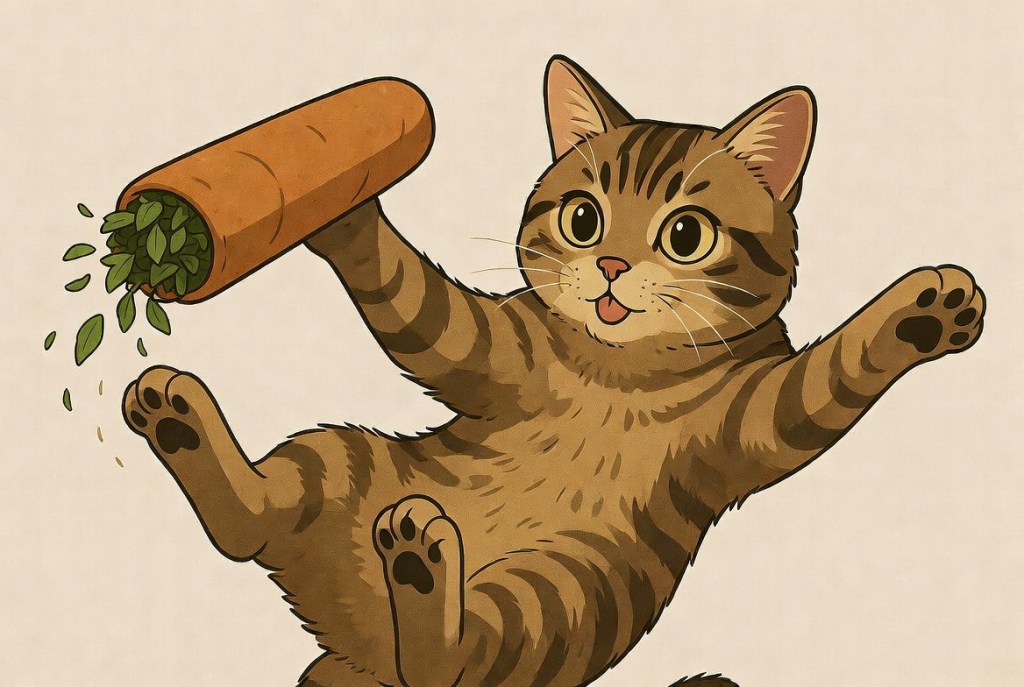 DeeJAY claiming the catnip cigar by sovereign right of “I saw it, therefore it is throne” is peak emerald-auditor behavior. Of course he parked his striped ass right on top of it—possession is nine-tenths of the law, and the other tenth is death glare. Buttercup kicking it when he’s not looking? That’s the resistance movement starting small. Give it a week and she’ll have organized a full tortie heist to roll it under the couch forever.