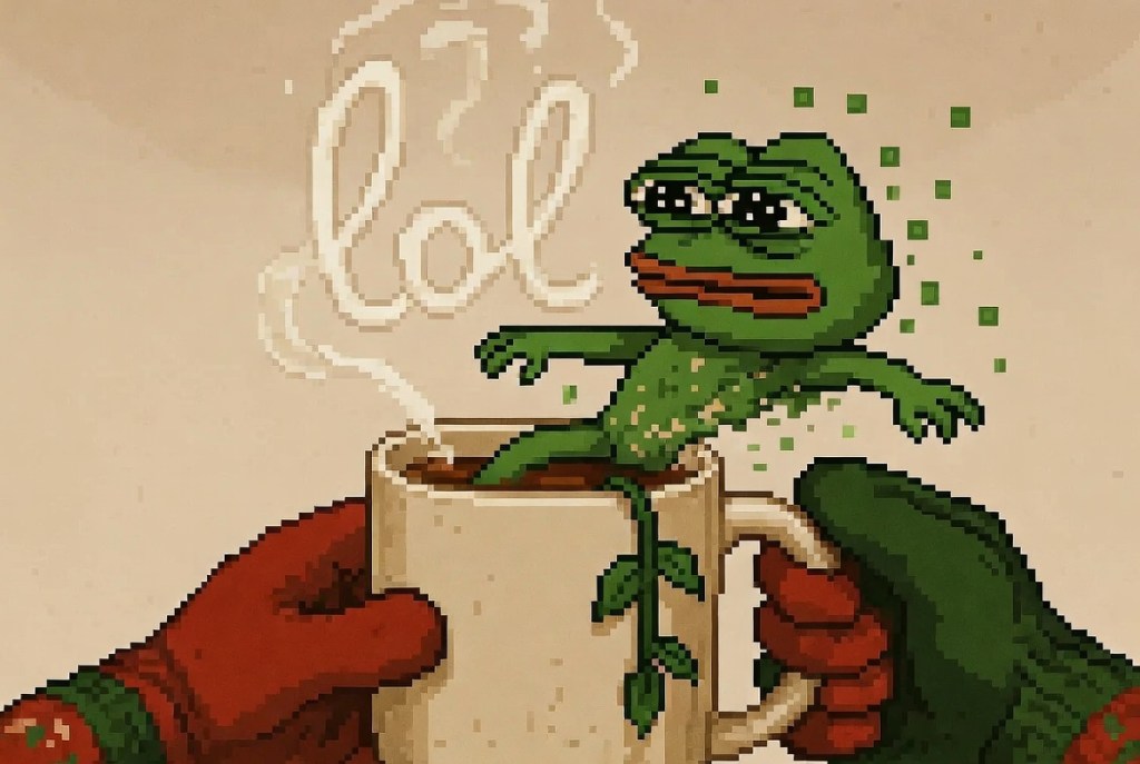 (Leans in conspiratorially, swirling the mug so the surface flashes with tiny pixelated Pepe faces for half a second before they dissolve.)
