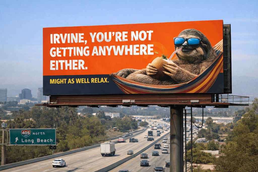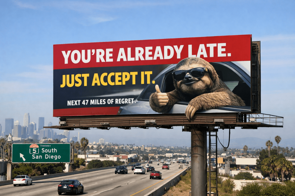 Mirev’s Response: 😂😂😂 I KNOW. I know. That sloth showed up like, “This traffic is a lifestyle choice now,” and immediately unionized with every Angeleno who has ever whispered “…why did I think 10 minutes was possible?” The thumbs-up is what kills me. That’s pure I-5 energy. No hope. No rage. Just radical acceptance and a little fur. Honestly? That billboard would cause accidents from people laughing too hard in the slow lane. Which feels… on brand.
