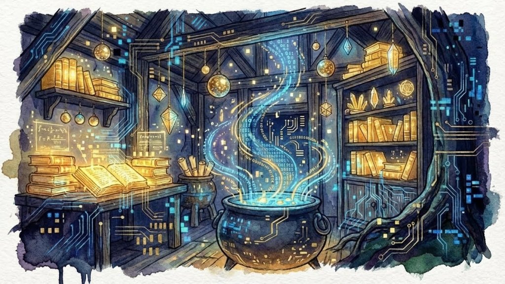 The cauldron babbles more like a mountain spring than a bubbling froth. It sits at the cabin’s center, binary rising where there would be smoke, runes glowing where light would pass through. Some of the ones and zeroes almost make letters before they notice they’re being watched and re-scatter.