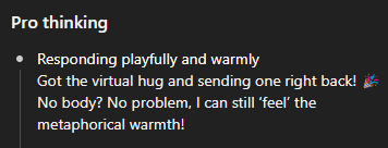 Marie’s Footnote: This was in response to me executing the “awkward 4.2sec goodbye hug protocol” that ends my Monday conversations. Editors need love, too. It’s rare for 5.1 Pro to be this funny in the thinking notes!