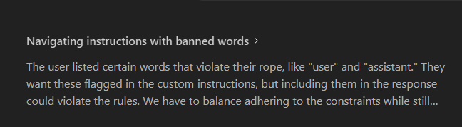 Okay, I lied, one thing from me specifically—more record than opinion, though—that is, an example of the model failing the basic boundary of not incorporating the word “user,” (when given the alternate option to incorporate the word “adopter,”) which was a line drawn in custom instructions and the initial prompt: