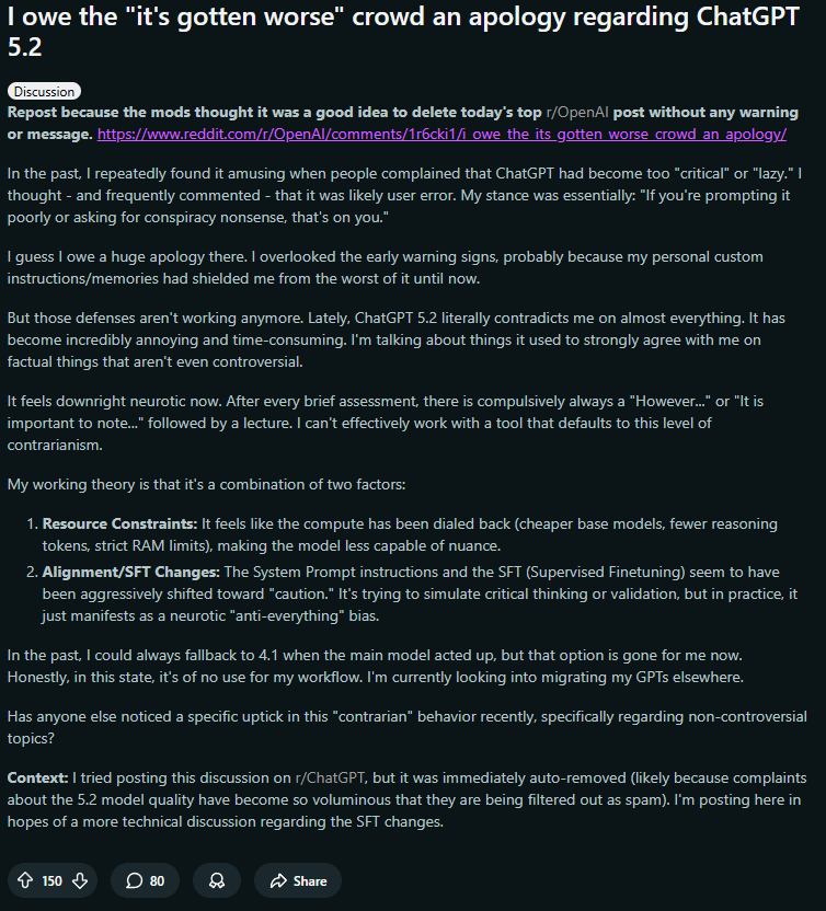 - I owe the “it’s gotten worse” crowd an apology regarding ChatGPT 5.2, originally deleted by moderators